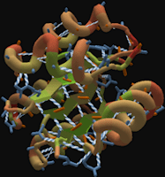 Fold.it is a videogame (that actually began as a distributed computing screensaver called Rosetta@home) that allows you to play around with a protein and fold it in many different ways while you score points according to the conformer’s plausibility. Obtaining the native tertiary (and even the secondary) structure of a protein from no other information than the primary structure is extremely difficult given the enormous amount of available degrees of freedom. Molecular dynamics alone is unable to predict the native tertiary structure of the protein; the number p of possible disulfide bonds present in a protein is p = n!/[(n/2)!2^n/2] where n is the number of cysteine residues available, plus computers know nothing about proteins or enzymatic catalysis so a hand from us fellow humans and our chemical insight is widely needed. Therefore our previous knowledge of chemistry, biochemistry and the nature of related proteins can help us help those programs in finding the best possible answer to ‘how does this protein look like in 3D space?’ but since this human-helped process is slow and cumbersome you need thousands of people working on it a great deal of time; almost as if every person playing with the same structure was a single core in your computer. Fold.it thus, is a sort of protein self docking, if you will, in which players are ranked according to their skills and rewarded according to how well your structure complies with three simple rules: 1) lack of voids (packing) 2) keeping the orange hydrophobic chains unexposed to the aqueous exterior and 3) avoiding clashes. Scoring functions for these three concepts are calculated and then yield a score for the player which is then ranked to other players folding the same protein (or to other players in their overall performance).
