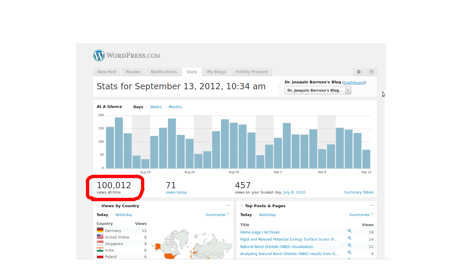 The blog started about 3.5 years ago when I was still living in Romania working at the lab of the late Prof. Dr. Ioan Silaghi-Dumitrescu. Back then I started the blog as a way to make my research visible to others and maybe in that way I could gain some notoriety which could help me in the near future to land a fine research position. None of that happened. I remember we were having some issues with some PCM calculations in the lab and after a lot of hard work and a lot of asking we gather some tips to work with implicit solvation models in Gaussian. Prof. Silaghi suggested we should write them down and put them on the wall of the lab so we had them available at all times; it was then when I suggested we could place them in my little blog so we had them available online. This happened in September 2009, three years ago, and little did I know, this post became quite popular, it is still one of the most visited ones in the blog. Later on we had a similar problem while trying to visualize Natural Bond Orbitals, there was too much information but it was all scattered, so we did it again, we gathered some of the info and made a new post which became also quite popular.