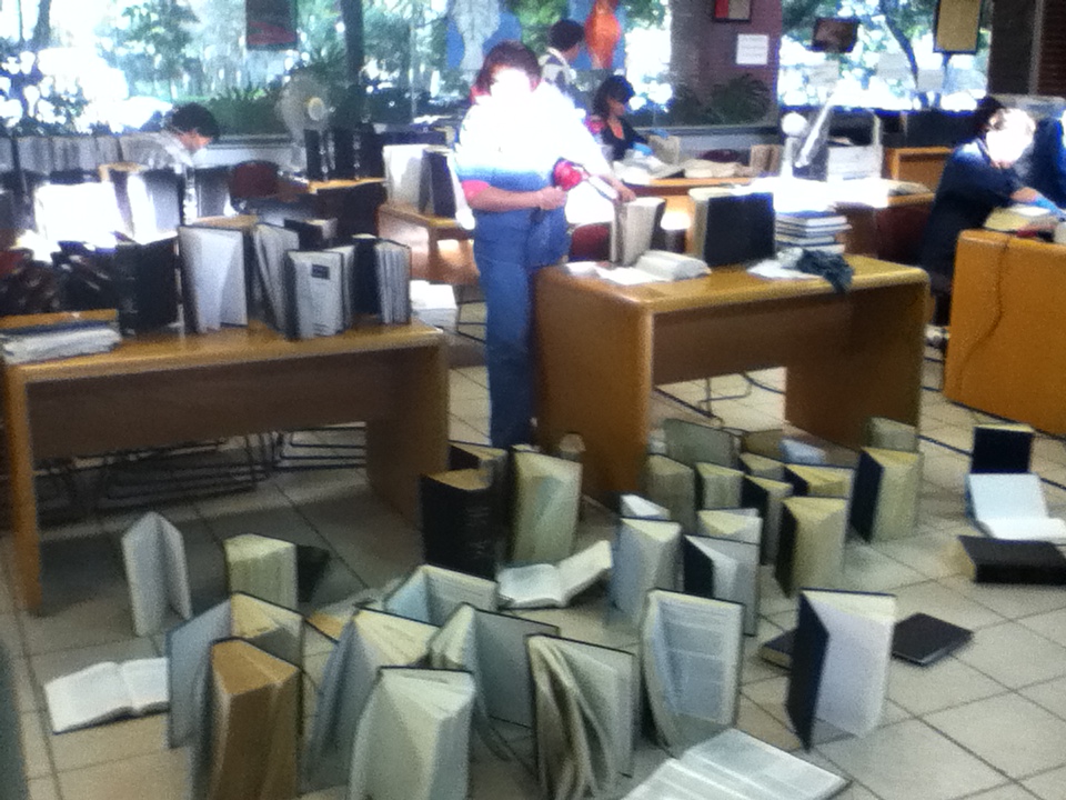 This morning the librarians were appalled when noticed not only the huge puddle on the floor but all the books and scientific journals that were dripping water from the shelves. The broken pipe has been fixed and the water on the floor has been mopped. It is now the books the ones that suffer the aftermath of this accident. Not only saving the information was important; wet paper is a great culture media for fungi which in turn could pose a health threat to all users. The administrative staff immediately got to work in recruiting academics and students to help the drying process: “Heal a book!“, they informally called it. Everyone grabbed an item and with the help of industrial blow dryers – the kind we use in chemistry labs to dry wet glassware – and an extraordinary amount of paper towels, each person got to dry the journals page by page.