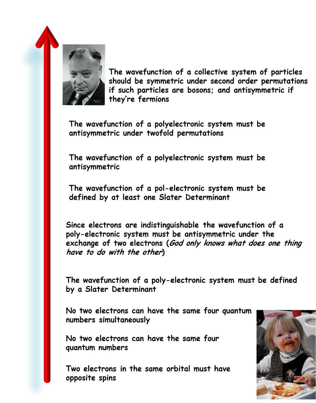 Pauli’s Exclusion Principle is a paramount concept in Quantum Mechanics which has implications from statistical mechanics to quantum chemistry, consequently, there are many different statements to summarize it depending on the forum. I occasionally joke with my students about how we learnt it in kindergarten an how we state it now at the end of our computational chemistry course.