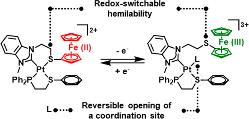 Chiefly developed by the Chad Mirkin group at Northwestern, the WLA has now reached a new milestone in which the allosteric control is further coupled to a redox equilibrium which alters the strength of the hemilabile bonds. These findings are reported in JACS as a communication (DOI: 10.1021/jacs.8b09321). Previous efforts were unsuccessful due to the instability of the oxidized species, which makes regulation challenging. A ferrocenyl (Fc) group was attached to the hemilabile ligand to provide the redox center which can further assist and control the ring opening via an increment in the electrostatic repulsion of the two metallic centers. Thus, the weak-link is displaced by exogenous ligands only after the Fc group was oxidized.