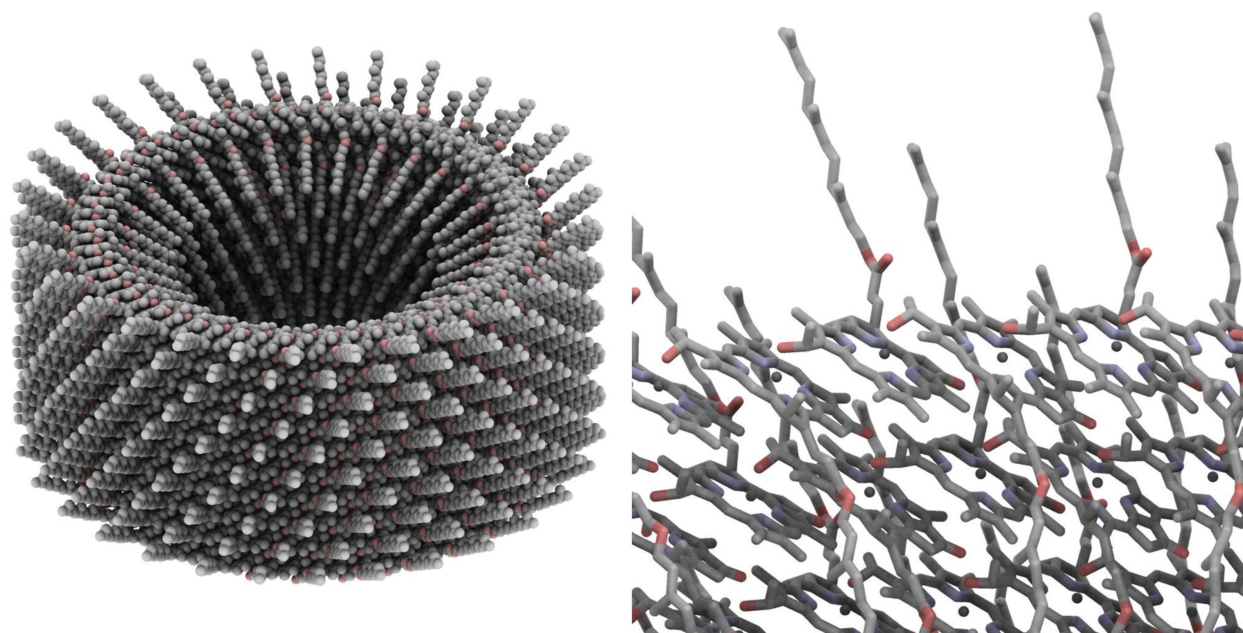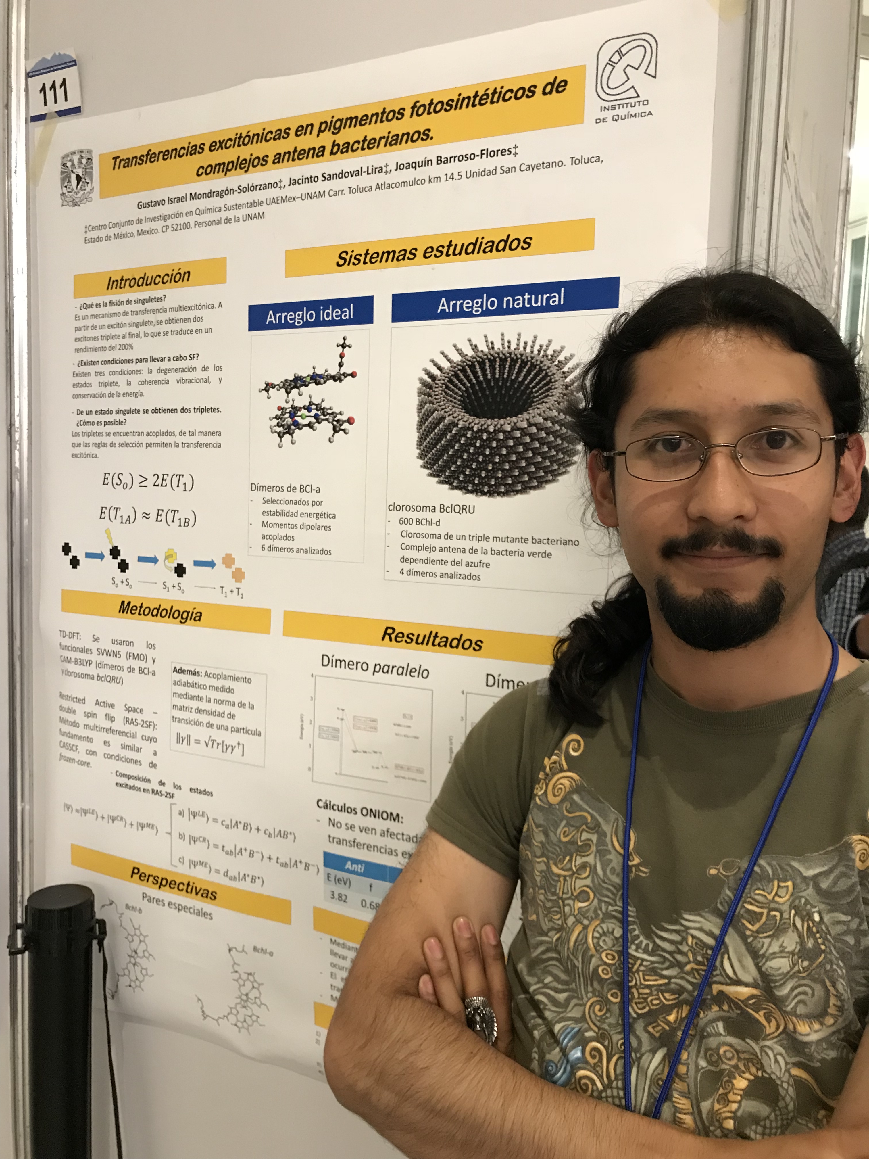 We celebrate the successful thesis defense of Gustavo “Gus” Mondragón who has now completed his Masters degree and is now on to getting a PhD in our group. Gustavo has worked on the search for multiexcitonic states and their involvement in the excitonic transference between photosynthetic pigments, specifically between bacteriochlorophyll-d molecules (BChl-d) from the bchQRU chlorosome whose whole structure is shown in the gallery below. To this end, Gustavo has studied and implemented the Restricted Active Space method with double spin flip (RAS-2SF) with the use of QChem5.0, a method that has required the use and understanding of states with high multiplicities. Additionally, Gustavo has investigated the influence of the environment within the chlorosome by performing ONIOM calculations for the spectroscopic properties of a BChl-d dimer, finding albeit qualitatively a batochromic effect, probably an expected result but nonetheless an impressive feat for the level of theory selected.