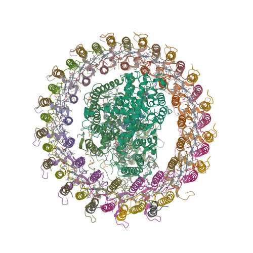 So, how can B. viridis use BChl-b molecules to absorb near IR radiation and how does it achieve this remarkable red-shifting effect? The LHC1 structure was solved in 2018 by Qian et al. through Cryo-EM at a 2.9 Å resolution; it is comprised of 17 protein subunits surrounding the so called photosynthetic pigments special pair. Each of these subunits is made up of three α-helix structures surrounding two BChl-b and one dihydroneurosporene (DHN) molecule for a total of 34 of these photosynthetic pigments inside the LHC and 17 DHN molecules interacting between the protein structures and the