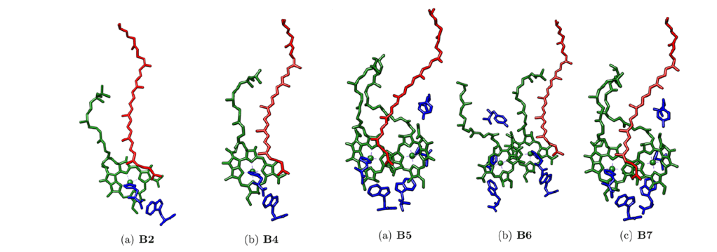 It was Dr. Jacinto Sandoval and Gustavo “Gus” Mondragón who brought this facts to our attention during their survey of potential candidates for calculating exotic exciton transfer mechanisms in photosynthetic organisms, part of Gustavo’s PhD thesis. To them, it was clear from the start that some sort of cooperative effect between pigments was operating and possibly leading to the red-shifted absorption, therefore a careful dissection of all possible pigments combinations was carried out and their UV-Vis spectra were calculated at the CAMB3LYP/cc-pVDZ on PBE0/6-31G(d) optimized geometries, leading to the systems shown below in figure 2.