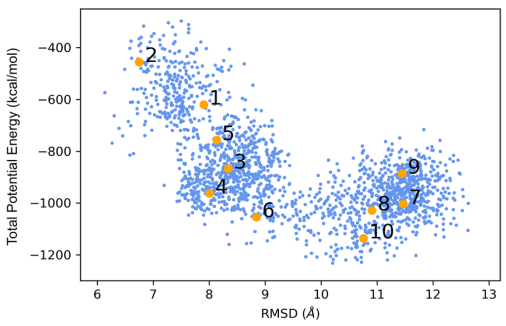 System B7 reproduced the red-shifted absorption at 1026 nm, but since the original structure was fitted from the Cryo-EM with a 2.9 Å resolution, “Gus” suggested reaching out to the group of Prof. Andrés Gerardo Cisneros and Dr. Jorge Nochebuena at UT Dallas for carrying out QM/MM calculations; this optimization included the proteins surrounding the pigments in the MM layer and the interacting residues (Hys coordinated to Mg2+ ions in BChl-b) along the chromophores were incorporated into the QM layer, however the thus obtained minima for the B7 system lost the main absorption in the near-IR region, therefore, Dr. Nochebuena suggested running an MD simulation (45 ns) and took a random sampling of ten structures (Figure 3).