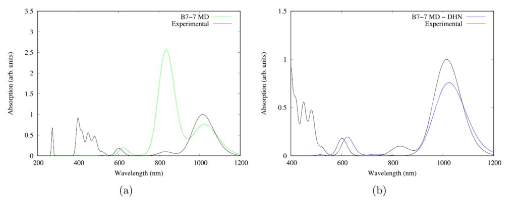 All structures in the sampling reproduced the red-shifted absorption (~1000 nm) successfully proving that cooperative and dynamic effects allow B. viridis to perform photosynthesis with low energy radiation (Figure 4). Therefore, close intermolecular interactions along with thermal/dynamical fluctuations allow for a regular pigment such as BChl-b to form near-IR absorbing photosystems for organisms to thrive in low conditions of solar light.