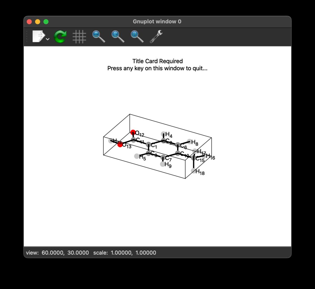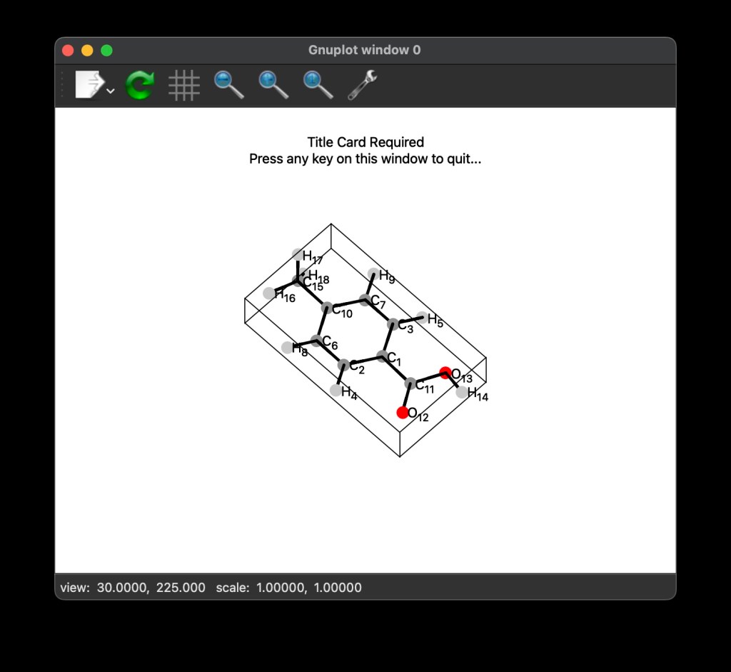 This program produces the gnuplot script 4-Methylbenzoic_acidQDMol.gnp. Option -r calls gnuplot to render the script, and option -t qt tells gnuplot to use the Qt terminal (if you do not have this terminal available to gnuplot, try with ‘-t wxt‘, ‘-t x11‘, or ignoring this option). The command will pop-up the following screen: