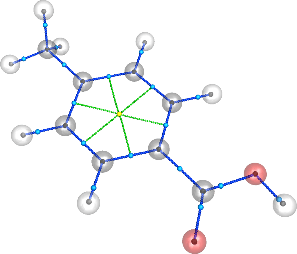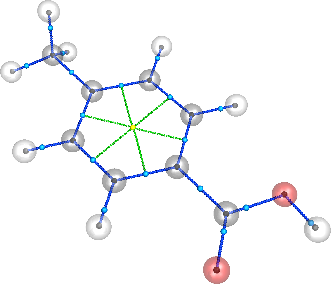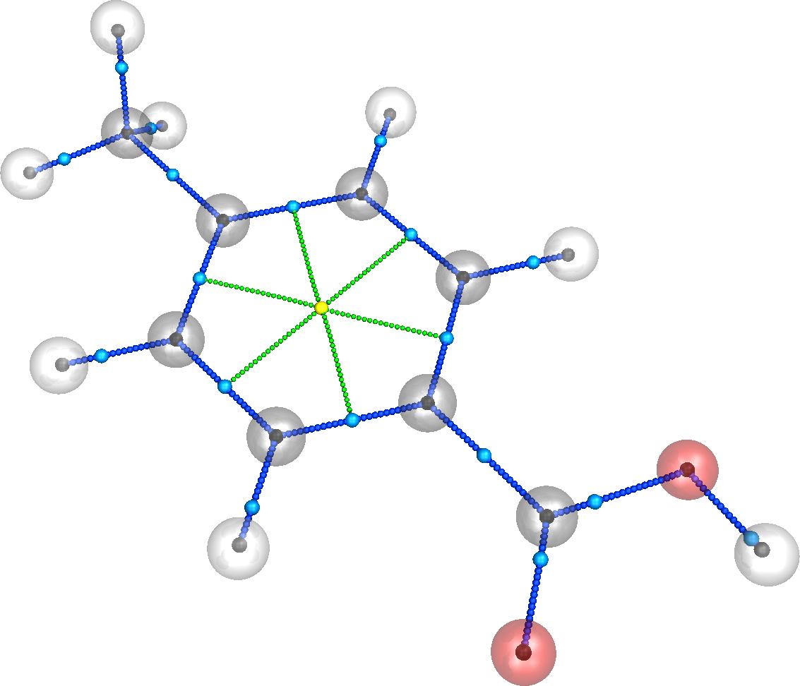 For dtkfindcp, options -P -k are used to render the 4-Methylbenzoic_acidRhoCP.png image and to keep the pov file, which is the PoVRay script; -a draws the atoms as transparent spheres; -g draws the gradient paths as sets of small spheres; -r computes the ring and cage paths (if needed), and -e performs an extended search. The above command produces the following figure (4-Methylbenzoic_acidRhoCP.png):
